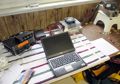 | The station set up for testing in the basement. The 900w homebrew SSPA works well. |